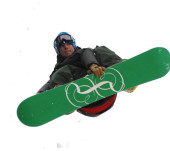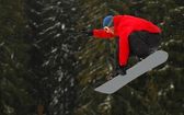 Snowboardzista podczas skoku w wysokie góry w słoneczny dzień.