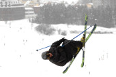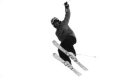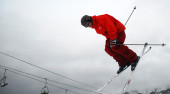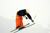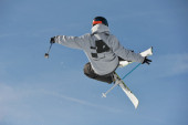 narciarz na skok w wysokich górach w słoneczny dzień.