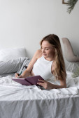 Młoda kobieta spędza dzień odpoczywając w łóżku, czytając książkę w swoim nowoczesnym mieszkaniu.