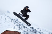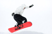 Snowboardzista podczas skoku w wysokie góry w słoneczny dzień.