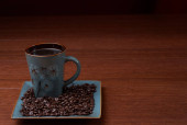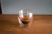 Mały szklany kubek zawierający ciemną kawę lub espresso na drewnianym stole, z zielonym, teksturowanym elementem tła powyżej