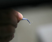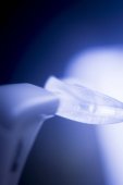 Zbliżenie elementu wyrobu medycznego, z okrągłą soczewką i rurką, z zamazanym tłem