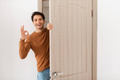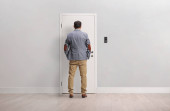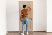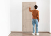 Osoba w czerwonym swetrze i dżinsach stoi plecami do widza, pukając do drewnianych drzwi w minimalistycznym pokoju. Ściany są białe, a podłoga drewniana.