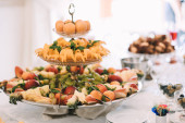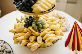 Stół bufetowy prezentujący świeże talerze owocowe, w tym ananas, truskawki, winogrona, melon i ciasteczka, tworząc żywe rozprzestrzenianie