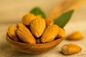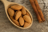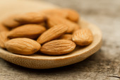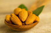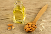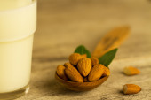 obrane migdały w łyżką i oleju w słoiku na drewniane tła