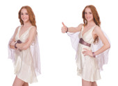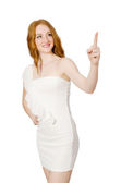 Ładna pani w jasnym uroczym stroju odizolowany na białym