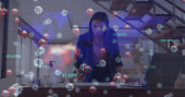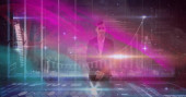 Walcowanie dwóch kobiet w fartuchach za pomocą wałka do ciasta przy kuchennym blacie z neonową nakładką. Ciasto, ciasto, tarta, pieczenie, piekarnia, współpraca, mentor