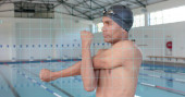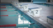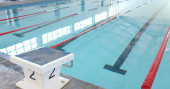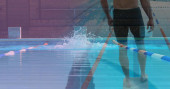 Przyczajony pływak w czapce gogle majtki przygotowujące basen nurkowy na bloku 2 bluza z kapturem dopasowująca stopę. Sportowiec, trener, trening, pasy ruchu, obiekt, okna, palmy