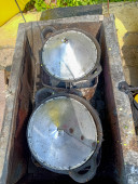 Słony talerz gotowania pod stożkowymi metalowymi pokrywami w rustykalnym drewnianym wózku z liściastymi zielonymi liśćmi tworzy autentyczną i lekko wietrzną atmosferę, nadającą się do prezentacji tradycji kulinarnych lub lokalnych ustawień rynkowych.