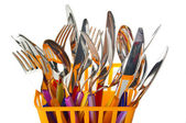 sztućce kuchenne, noże, widelce, łyżki w żółty stoją na białym tle