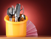 sztućce kuchenne, noże, widelce i łyżki na żółto stoją na czerwonym tle