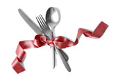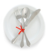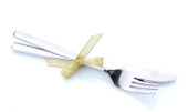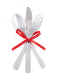 Silver widelec i łyżka, nóż, związany z czerwoną wstążką na białym tle