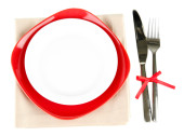 Biała płyta pusty srebrny widelec i łyżka, nóż, związany z czerwoną wstążką