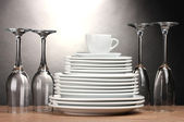 czyste płyty, okulary, kubek i sztućce na drewnianym stole na szarym tle