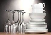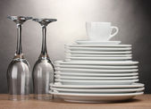 czyste talerze, szklanki i kubki na drewnianym stole na szarym tle
