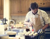 Mężczyzna przygotowuje kremowym sosem grzybowym