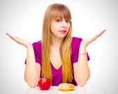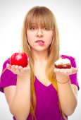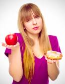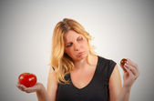 Kobieta, wybierając między owoce i słodycze