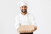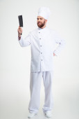Mężczyzna kucharz trzyma drewniana deska do krojenia