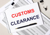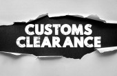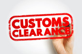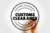 CUSTOMS CLEARANCE pokazane pogrubioną czerwoną pieczęcią w stylu pisma z ręką trzymającą znacznik, przekazującą przetwarzanie importu, logistykę i dokumentację graniczną