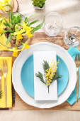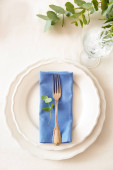 Pusty płyta, sztućce, serwetki i szkło na rustykalne drewniane tła. Świąteczny stół ustawienie koncepcja
