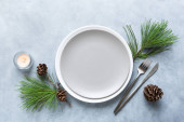 Zdjęcie "Pusty płyta, sztućce, serwetki i szkło na rustykalne drewniane tła. Świąteczny stół ustawienie koncepcja" może być wykorzystywane do celów osobistych i komercyjnych zgodnie z warunkami zakupionej licencji Royalty-free. Obraz jest dostępny do pobrania w jakości wysokiej rozdzielczości do 5760x3840.