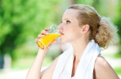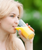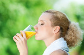 młoda kobieta pije sok pomarańczowy. odkryty