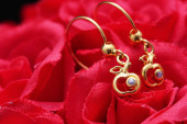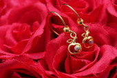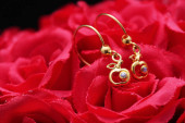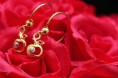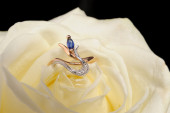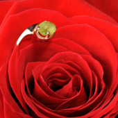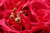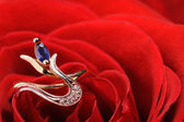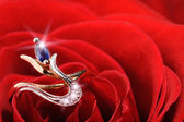 czerwona róża z pierścieniem z kamieni i krople wody