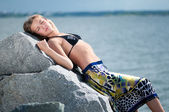 smutne kobiety stojącej na skale nad morze burza