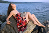 smutna kobieta w sukni siedzi na skale