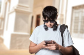 Przystojny młody człowiek z kręconymi włosami uśmiecha się podczas korzystania z telefonu w tętniącym życiem miejskim.