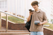 Zdjęcie "Przystojny młody człowiek z kręconymi włosami uśmiecha się podczas korzystania z telefonu w tętniącym życiem miejskim." może być wykorzystywane do celów osobistych i komercyjnych zgodnie z warunkami zakupionej licencji Royalty-free. Obraz jest dostępny do pobrania w jakości wysokiej rozdzielczości do 5760x3840.