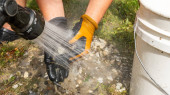 Poszczególne osoby wykorzystują wysokociśnieniowy wąż wodny do czyszczenia żwiru w pobliżu okna, demonstrując skuteczne techniki konserwacji zewnętrznej