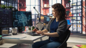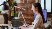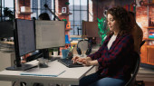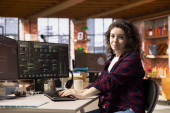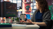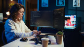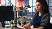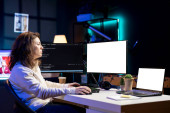 Zdjęcie "Deweloper oprogramowania w biurze agencji kodowania na jej komputerze, tworzenie oprogramowania i pracuje nad implementacją algorytmów. Eksperci IT budujący aplikacje z interfejsem programowania. Kamera A." może być wykorzystywane do celów osobistych i komercyjnych zgodnie z warunkami zakupionej licencji Royalty-free. Obraz jest dostępny do pobrania w jakości wysokiej rozdzielczości do 5760x3840.