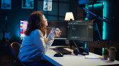 Deweloper oprogramowania w biurze agencji kodowania na jej komputerze, tworzenie oprogramowania i pracuje nad implementacją algorytmów. Eksperci IT budujący aplikacje z interfejsem programowania. Kamera A.