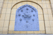 Delhi, Indie, 28 listopada 2025. Widok na herb Indii otoczony indyjską marynarką wojenną i pociskami sił powietrznych na ścianie Pomnika Wojny Narodowej.