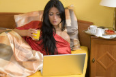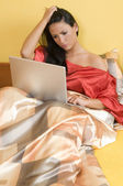 dziewczyna na kanapie z laptopem, ogląda w wyświetlacz expressio