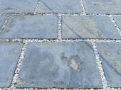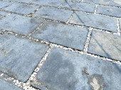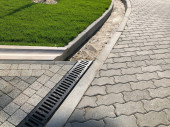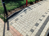 Obraz przedstawia zakrzywioną ścieżkę zewnętrzną wybrukowaną ciemnoszarymi kamieniami blokującymi w otoczeniu ogrodu z otaczającą zielenią i murowaną krawędzią tworzącą czysty, współczesny wygląd idealny do projektowania krajobrazu i projektów przestrzeni zewnętrznej..