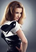 Piękna seksowna kobieta ze stylowym makijażem i kaskiem rowerowym