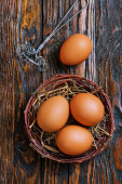 Zdjęcie "Brązowy jaj w gnieździe na ciemnym tle drewniane" może być wykorzystywane do celów osobistych i komercyjnych zgodnie z warunkami zakupionej licencji Royalty-free. Obraz jest dostępny do pobrania w jakości wysokiej rozdzielczości do 5760x3840.