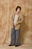 Pewny siebie nastolatek prezentuje styl i energię na prostym tle.