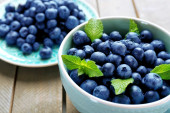 Świeże jagody z mięty na drewnianym stole z bliska