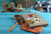 Zdjęcie "zdobione książka kucharska na niebieskim tle drewniane" może być wykorzystywane do celów osobistych i komercyjnych zgodnie z warunkami zakupionej licencji Royalty-free. Obraz jest dostępny do pobrania w jakości wysokiej rozdzielczości do 5760x3840.