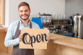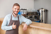 Wesoły mężczyzna właściciel kawiarni służy klienta