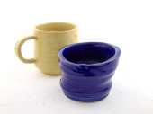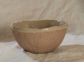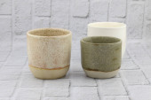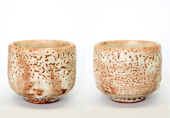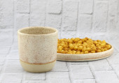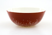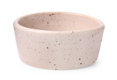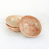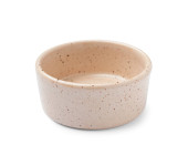 Układane ręcznie ceramiczne miski z błyszczącym szkliwem kremowym i brązowym wzorem kropki na neutralnym tle. Minimalistyczny produkt martwa natura podkreślając ceramiki rzemieślniczej, powolne życie i nowoczesny design zastawy stołowej.