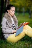 biznes kobieta, przeglądając dziennik w parku