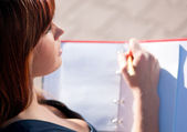 biznes kobieta, przeglądając dziennik w parku