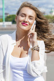 Piękna brunetka kobieta kontakt telefoniczny w parku lato