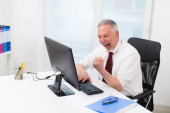 Stary biały biały biały mężczyzna w okularach podnoszący pięść patrząc na laptopa na stole roboczym w swoim biurze. Praca w firmie, Szef lub Senior Manager.