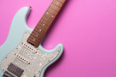 Nowoczesna gitara elektryczna na fioletowym tle, zbliżenie