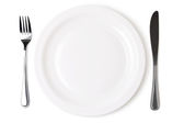biały pustej płyty z widelcem i nożem na białym tle